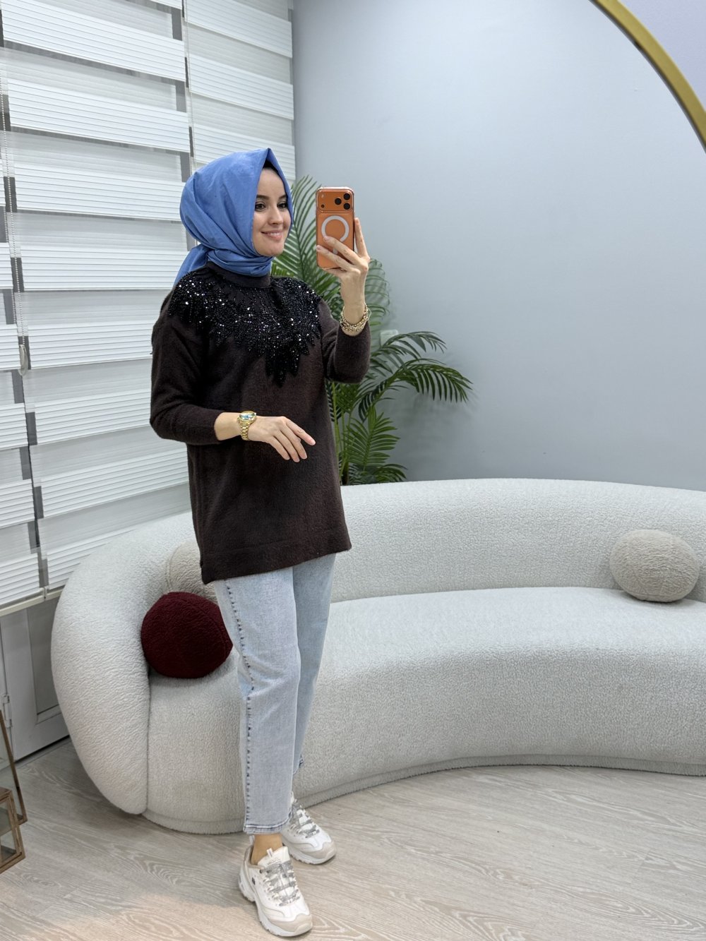 Boncuk Detaylı Yumoş Tunik Kahverengi