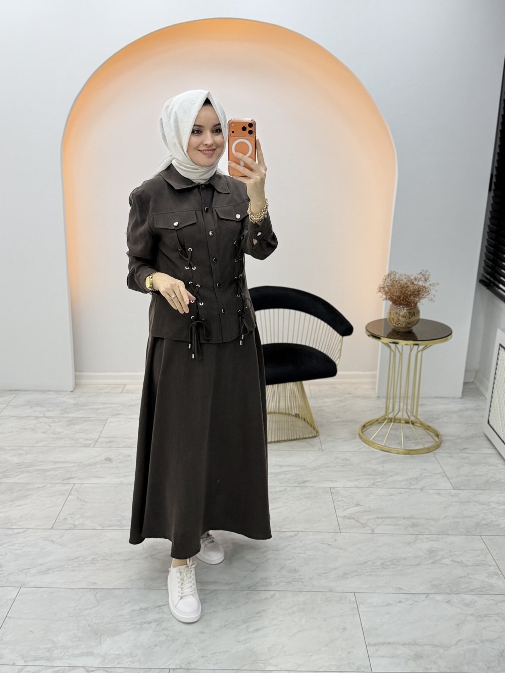 Çise Tensel Etekli Takım Kahverengi