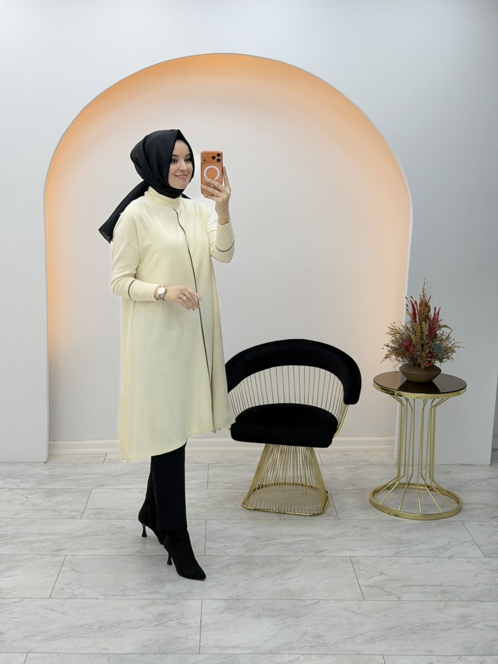 Çizgi Detaylı Panço Tunik Krem