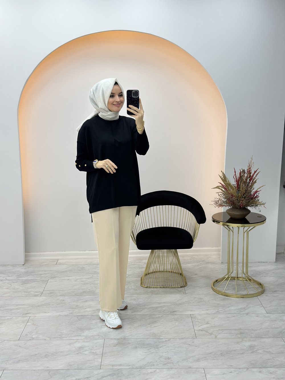 Düğme Detaylı Merserize Tunik Siyah