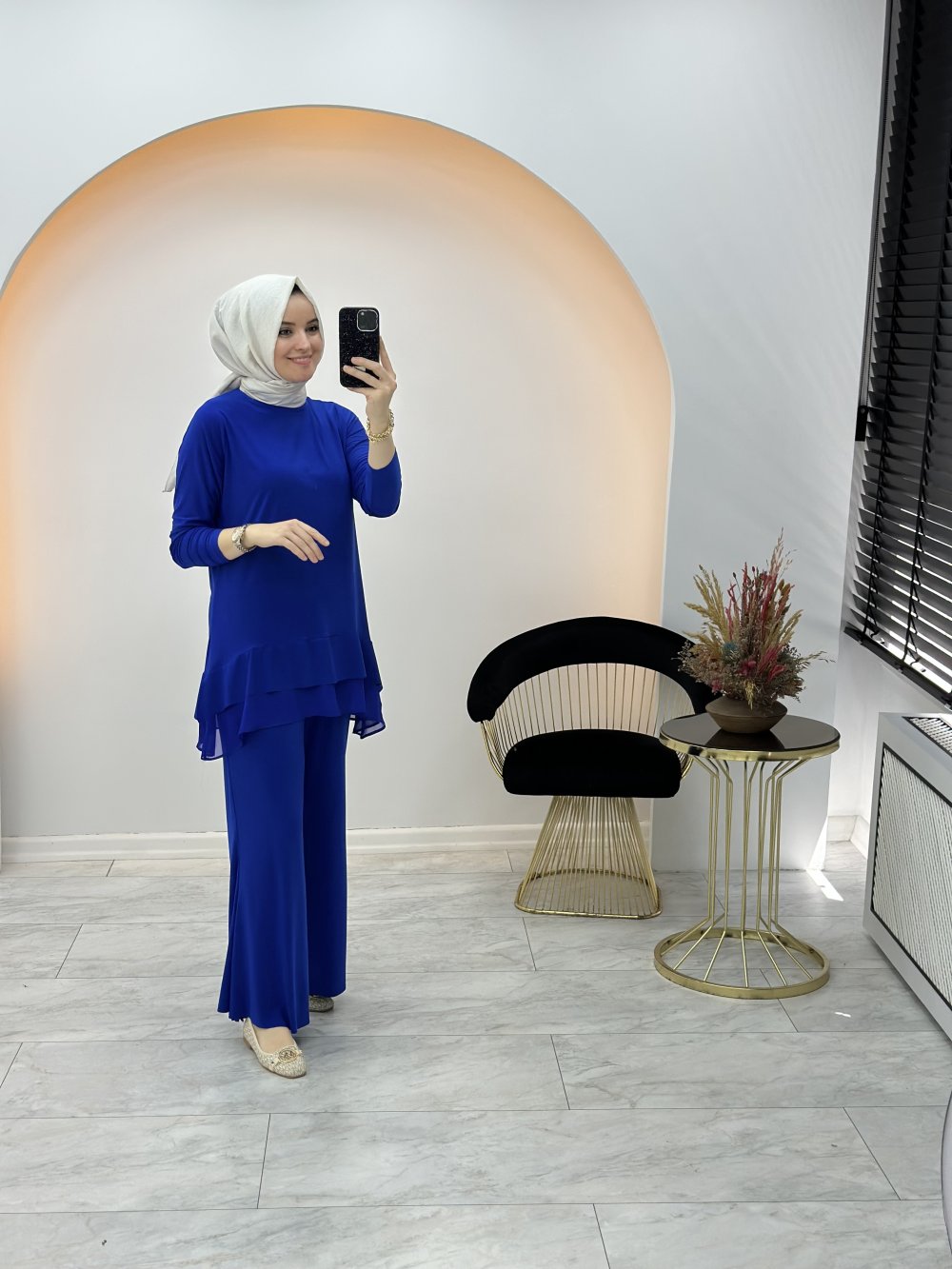 Gizem Şifon Detaylı Pantolon Takım Saks Mavisi