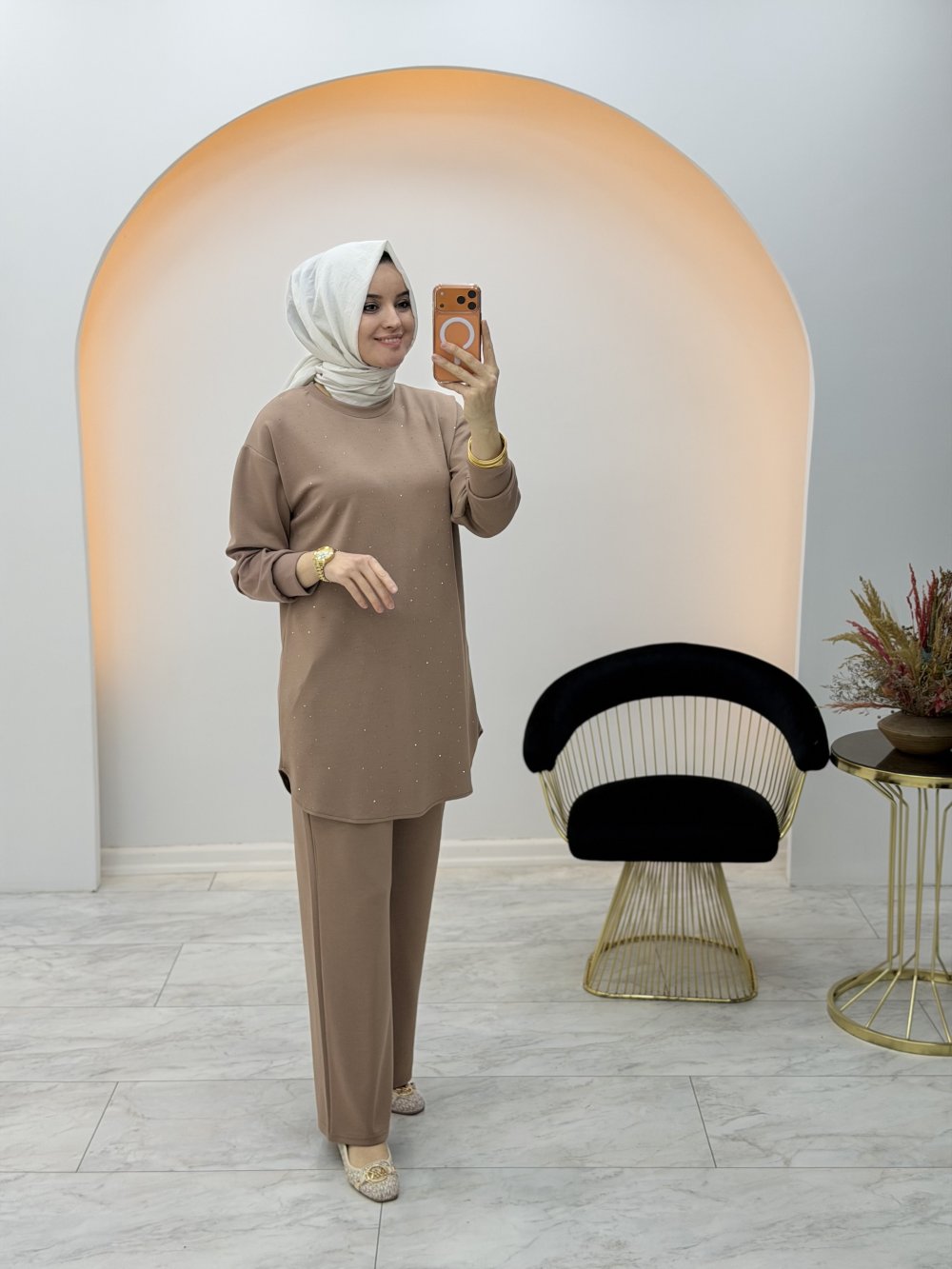 Linda Taşlı Takım Sütlü Kahve