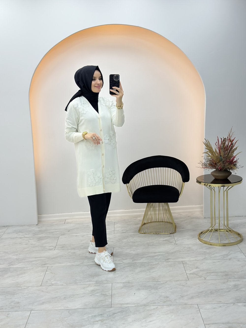 Üç Çiçekli Merserize Hırka Ekru